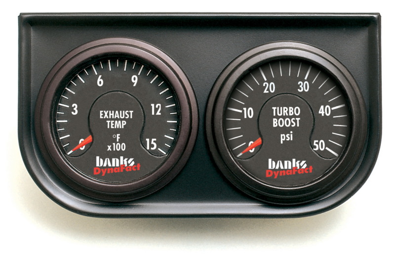 Engineered Performance. Easy - to - Read DynaFact Gauges. Electronically controlled 0 - 1500 Degree Pyrometer reads EGTs. 0 - 50 psi Boost gauge to monitor power and turbo performance. LED backlit. Banks exclusive DynaFact electronic gauges offer precision that can't be matched by mechanical gauges. The pyrometer provides exhaust - gas temperature (EGT) measurements that are accurate within - 15 Degree Fahrenheit at maximum operating temperatures. The pyro's spring - loaded, jeweled movement is resistant to vibration and sports a lit, easy - to - read 0 - 1500 Degree Fahrenheit face. Banks 0 - 50 psi boost gauge monitors power and turbo performance. Includes 2 - gauge mounting panel. Top - mount andor pillar - mount options available.