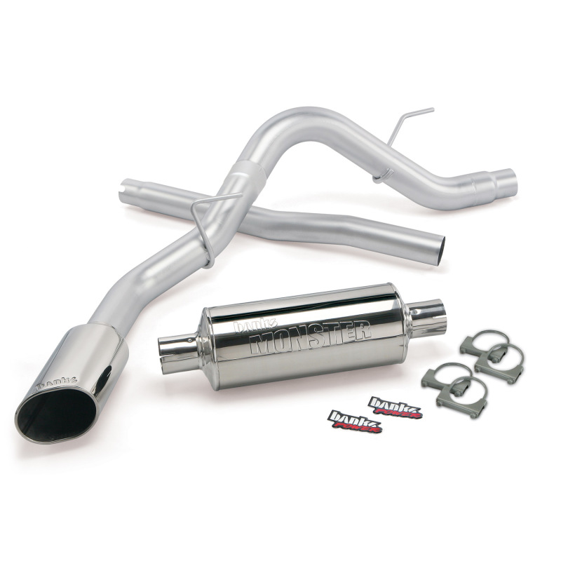 Free flowing direct - fit resonator - back system cuts backpressure. Throaty sound huge polished tip. Ford 3.5L EcoBoost. Constructed from heavy - duty stainless steel, Banks large bore, mandrel - bent Monster exhaust system connects to your trucks factory intermediate pipe, cutting backpressure and increasing flow. That gives you the best of all worlds - increased power, greater longevity and maximum fuel efficiency. The polished - stainless straight - through muffler outflows stock by a mile and delivers a commanding, yet civil, exhaust note. This system has been specifically developed to work with the factory resonator (where equipped) to eliminate in - cab drone and resonance which can be very pronounced on variable cam timing V6s, while maintaining a throaty performance sound. The system includes Banks exclusive ob - round (patented design) angle - cut rolled - edge tailpipe tip in your choice of polished chrome - over stainless or high - temp black And to help keep it looking good, theres a 12 in. air gap to keep heat from tarnishing the finish. An adjustable clamp lets you position it on the tailpipe just right. The lightweight, direct - fit - system bolts on easily. Looks great on the Tremor Fully compatible with Fords factory warranty and so durable that its covered by Banks 5 - Year Limited Warranty Monster Exhaust System, Single Exit, Chrome Obround Tip for use with 2011 - 2014 Ford F - 150, 3.5L EcoBoost, 5.0, 6.2L all CabBed
