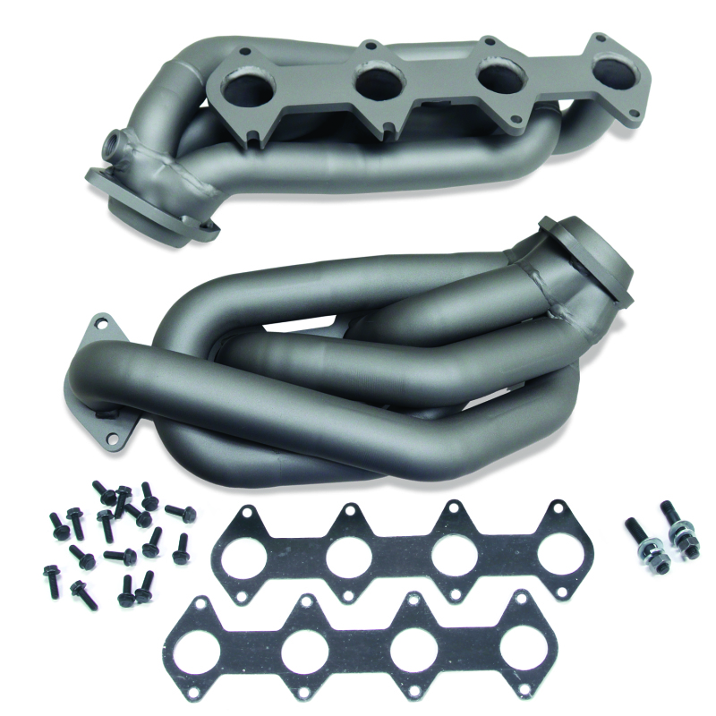 These BBK Performance shorty tuned Length exhaust Headers are designed and constructed as direct fit replacements for all 2005 - 10 Mustang GT applications. Each header is manufactured with 1 - 58 in. CNC mandrel bent tubing that offers unrestricted exhaust flow for increased horsepower and torque over factory OEM manifolds. BBK tuned Length headers offer improved scavenging waves for better combustion, which leads to improved performance and fuel economy over stock or equal Length headers. As with all BBK Performance exhaust headers they feature a 38 in. laser cut flange for additional strength and a guaranteed leak free fit. All headers are robotically and precision hand welded and then pressure tested to ensure years of reliability and performance in the real world. All BBK exhaust headers are available in a high temp titanium ceramic or polished silver ceramic coated finish and include new exhaust header gaskets, header bolts and hardware to complete the installation.