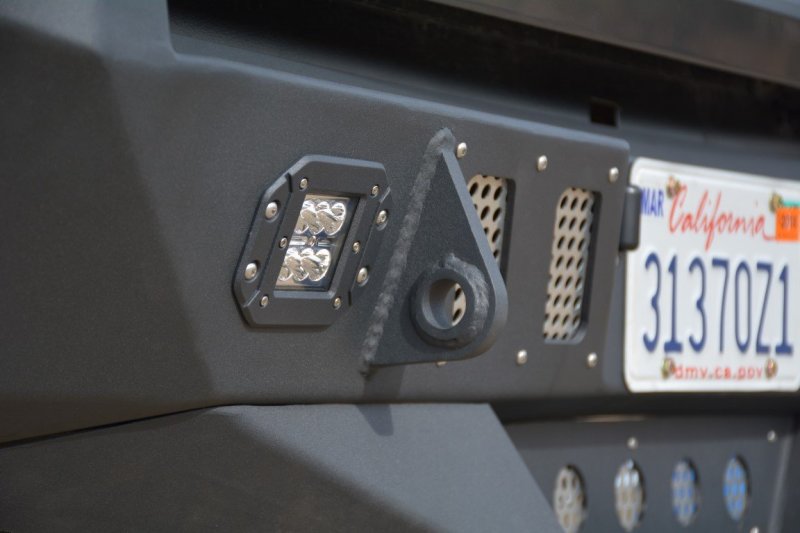 RBTT1 - 03 2016 Toyota Tacoma Rear Bumper. The DV8 Offroad RBFF1 - 02 rear bumper is designed to provide exceptional protection at a fraction of the weight of ordinary steel bumpers. Although these bumpers are made with 316 inch steel with 14 inch reinforcements throughout, DV8 shaves every pound possible off of the bumper with strategic cutouts and mesh aluminum grills that can be removed and color keyed to the vehicle. DV8 also integrates 2 LED backup lights into the bumper for improved visibility while backing up. This bumper has 2 shackle recovery points and utilizes the factory license plate lights and comes in a lightly textured black powder coat. Key Features Optional step for easy access, Lighter than normal steel bumpers, Mesh aluminum grills that can be color keyed to the vehicle, LED backup lights, Retains access to spare tire, Comes powdercoated, Lights Included.