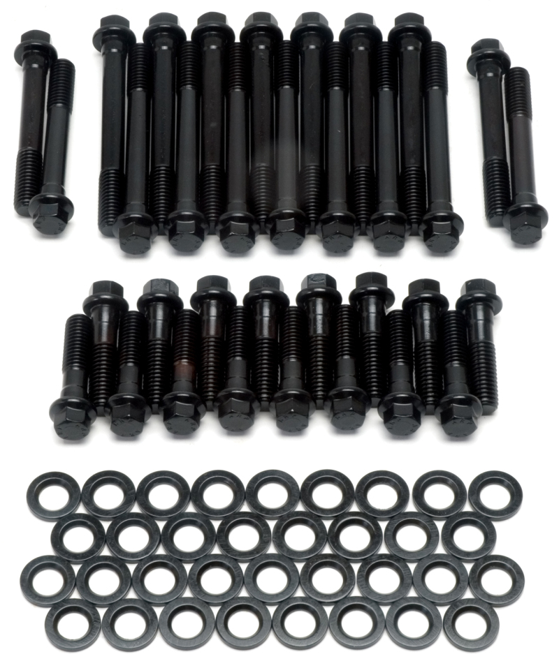The Edelbrock 8550 bolt kit contain a complete set of the highest quality head bolts and hardened washers available. Cold - formed to ensure molecular integrity and heat treated prior to thread rolling and machining. Reduced diameter bolt heads eliminate the need for valve train removal to facilitate cylinder head re - torqueing. Hardened and parallel - ground washers are included. Rated at 170,000 p.s.i.