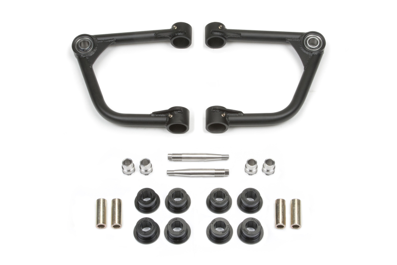 Arms eliminate upper ball joint w super strong 1in ID Stainless American Uniball. Additional caster is built into Arms for greater align ability to help with problematic leveling kit alignments. Allows for increased wheel travel when used with Dirt Logic 2.5 Coilover shocks. Chromoly tubing reduces flex found in stock arms for more positive road feel. 4340 Heat treated Uniball pin fits into factory ball joint taper without modification to the spindle for easy return to stock feature. Arms are direct replacements for factory arms on suspensions that require additional strength and align ability. Built with same materials as found on Trophy Trucks. .120in Wall 4130 Chromoly Tubing. 1.250in OD. .250in wall DOM Bushing Barrels. 1in ID Stainless Steel American Uniball. 17 - 4 Stainless Misalignments