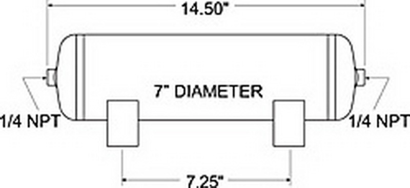 This Firestone air tank provides a source of compressed air for an air spring system. Tank has 2 - gallon capacity and (2) 14 in. NPT ports. Tank is enamel coated to resist corrosion, tested to be SAE J10 compliant and capable of 150 psi. Features Provides compressed air source for an air helper spring system Allows for faster inflation of air springs Holds 2 gallons of compressed air Includes 14 in. NPT ports (2) Steel tank with brass fittings Resists corrosion with internal and external enamel coating Is SAE J10 compliant Operates at up to 150 psi of maximum pressure Specs Tank dimensions 14.5 in. long x 7 in. diameter Tank capacity 2 gallons Inflation ports 14 in. NPT PSI Maximum of 150 2 - Year limited warranty