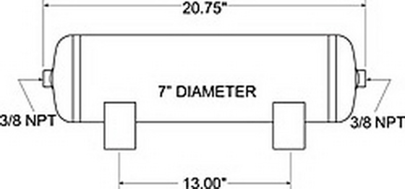 This Firestone air tank provides a source of compressed air for an air spring system. Tank has 3 - gallon capacity and (2) 38 in. NPT ports. Tank is enamel coated to resist corrosion, tested to be SAE J10 compliant and capable of 150 psi. Features Provides compressed air source for an air helper spring system Allows for faster inflation of air springs Holds 3 gallons of compressed air Includes (2) 38 in. NPT ports Steel tank with brass fittings Resists corrosion with internal and external enamel coating Is SAE J10 compliant Operates at up to 150 psi of maximum pressure Specs Tank dimensions 20.75 in. long x 7 in. diameter Tank capacity 3 gallons Inflation ports 38 in. NPT PSI Maximum of 150 2 - Year limited warranty