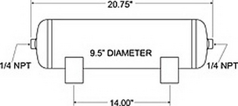 This Firestone air tank provides a source of compressed air for an air spring system. Tank has 5 - gallon capacity and (2) 14 in. NPT ports. Tank is enamel coated to resist corrosion, tested to be SAE J10 compliant and capable of 150 psi. Features Provides compressed air source for an air helper spring system Allows for faster inflation of air springs Holds 5 gallons of compressed air Includes (2) 14 in. NPT ports Steel tank with brass fittings Resists corrosion with internal and external enamel coating Is SAE J10 compliant Operates at up to 150 psi of maximum pressure Specs Tank dimensions 20.75 in. long x 9.5 in. diameter Tank capacity 5 gallons Inflation ports 14 in. NPT PSI Maximum of 150 2 - Year limited warranty