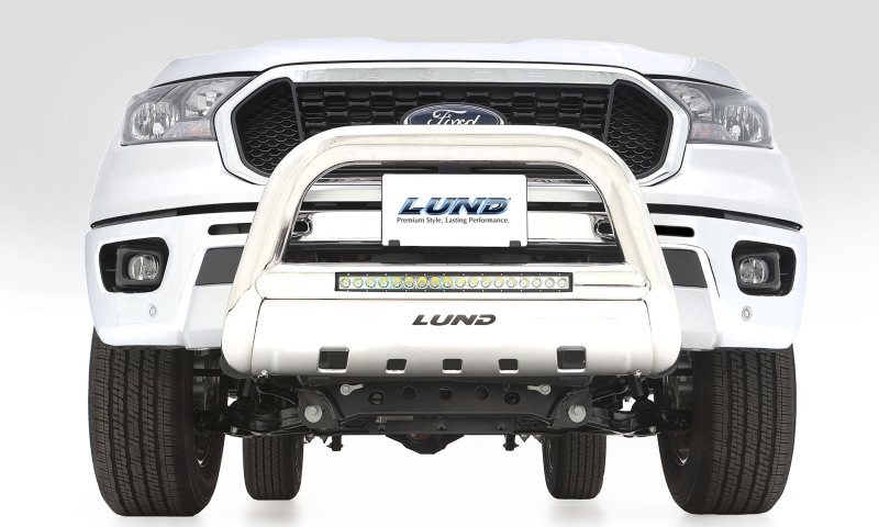 Protects your front end from flying debris with 3.5 inches of oval steel tubing. These bull bars also boost your visibility with an integrated 20 in. LED light bar. The included heavy duty light bar illuminates your night driving with a bright flood beam pattern and is easily wired into your factory light wiring, or a wiring harness can be purchased separately. Available in black textured powder coat or polished T304 stainless steel finish. Our popular LUND bull bars may now be ordered with a wire harness kit. The wire harness kit is also sold separately for lighting and accessories up to 30 Amps. LUND's bull bars with LED light bar and wiring kit is the total package to see and be seen, providing complete front end style, lighting and protection.