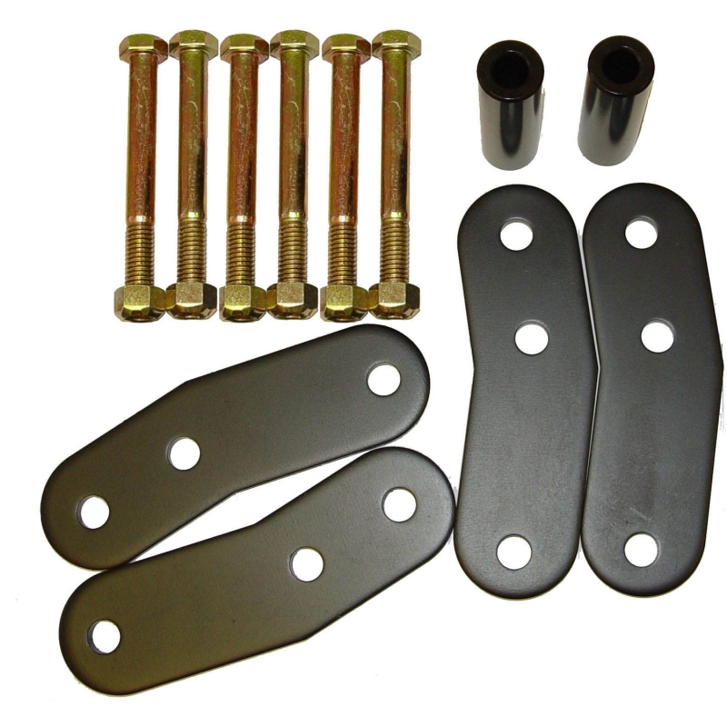 This pair of heavy - duty, easily greased steel rear leaf spring shackles from Rugged Ridge provides 1 - in. of lift. No bushings included. Bolt on application. No drilling required.