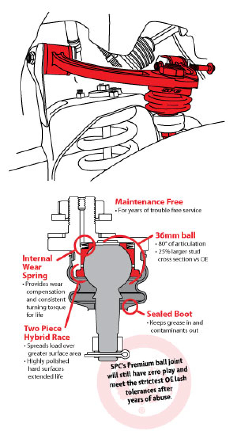 Improve droop travel, drivability and tire wear as well as adjusting tire position in your wheel well with SPC's adjustable front upper control arms for the Frontier, Pathfinder, and Xterra. Featuring our long life maintainable ball joint and SpecRide bushings, this arm is designed to correct alignment angles while maintaining factory ride quality. SPC's integrated tubular and cast steel design provides the strength and durability needed for the most demanding environments. These remove and replace armsare available in pairs for lifted and off - road applications. Get more droop travel SPC's arm has improved clearance to get around the spring bucket when the arm droops, eliminating arm to frame contact on lifted trucks. The maintainable ball joint has an oversized ball and allows more than 80deg of articulation to ensure it never binds. SpecRide bushings have free pivot to eliminate any chance of bushing failure seen on many high travel suspensions. Get your drivability and tracking back When you lift your truck you affect caster and camber. SPC's arms have 1deg of caster built into them. Using its patented ball joint design the arm will get you - 1deg to 3deg of caster and - 2deg of camber. Get your tire where you want it in the wheel well Use adjustment in the control arm and on the OE lower cams to maximize alignment angles and move oversized tires forward in the wheel well to minimize or avoid fender trimming. To make installation easier, SPC now includes a bolt to replace the driver's side rearward bolt, which often needs to be cut out to remove the original arm. If you need more bolts for the other positions order pn 21035 replacement bolt kit (2 bolts). Do you need replacement cams for the lower controlarm Check out SPC pn 87520, which will replace corroded cam bolt assemblies, or can be used on trucks not equipped with factory cam bolts for the lower control arm. These cams should be used with the upper arm kit