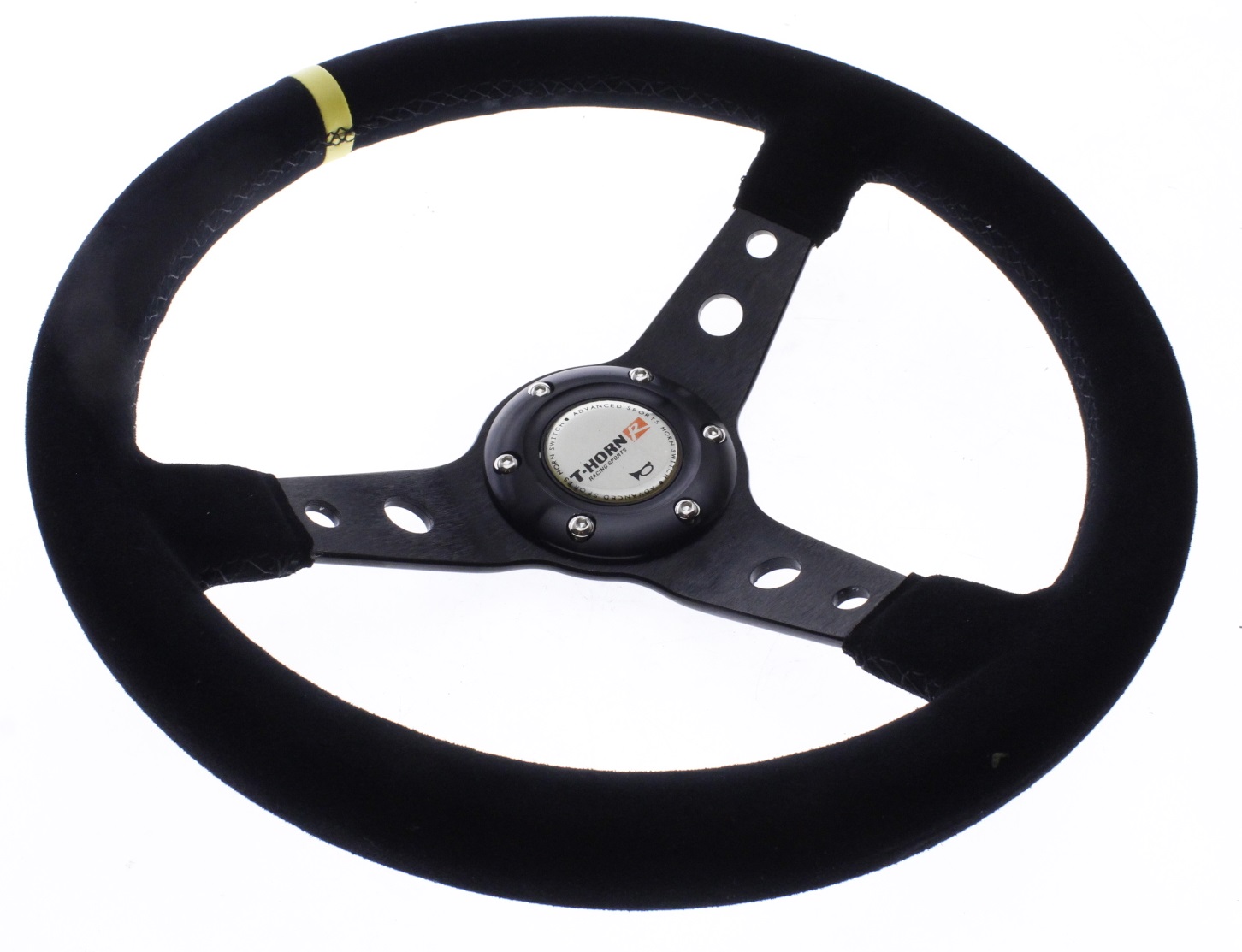 Really fine steering wheel for mounting in a race car or street car to race. The steering wheel is with suede and gives a really good grip so you have a really good sense of control when you race. The suede steering wheel has a diameter of 350mm. and fits with all inverters for steering wheel such as Sparco, OMP etc. With this steering wheel you can connect the thigh horn where the button is in the middle.