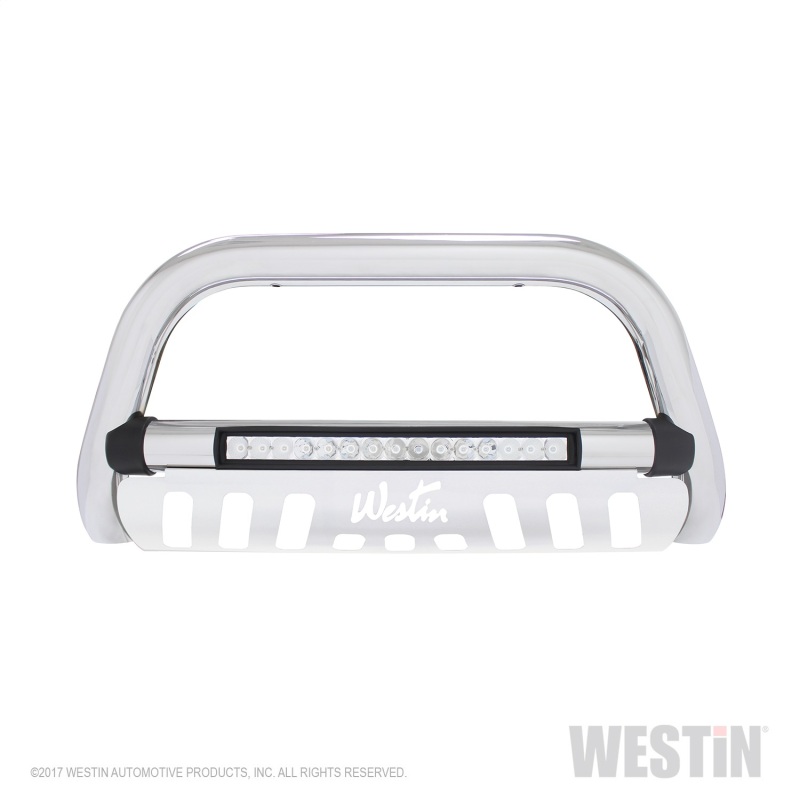 Westins Ultimate LED Bull Bar will take your truck to the next level with this cool new look The integrated light bar is a 20 single row with 15 x 3 Watt Osram LEDs. The LED light bar is flush mounted in the center cross tube and weather sealed for moisture resistance. Built with 3 steel tubes, our Ultimate LED Bull Bar features molded transition bushings and a brushed stainless steel skid plate for a perfect look. The product is available in chrome plated stainless steel backed by a lifetime warranty, and in textured black powder coat backed by a 3 - year warranty. Make a bold statement with Westins new Ultimate LED Bull Bar and give your truck the durability, look and style it deserves.