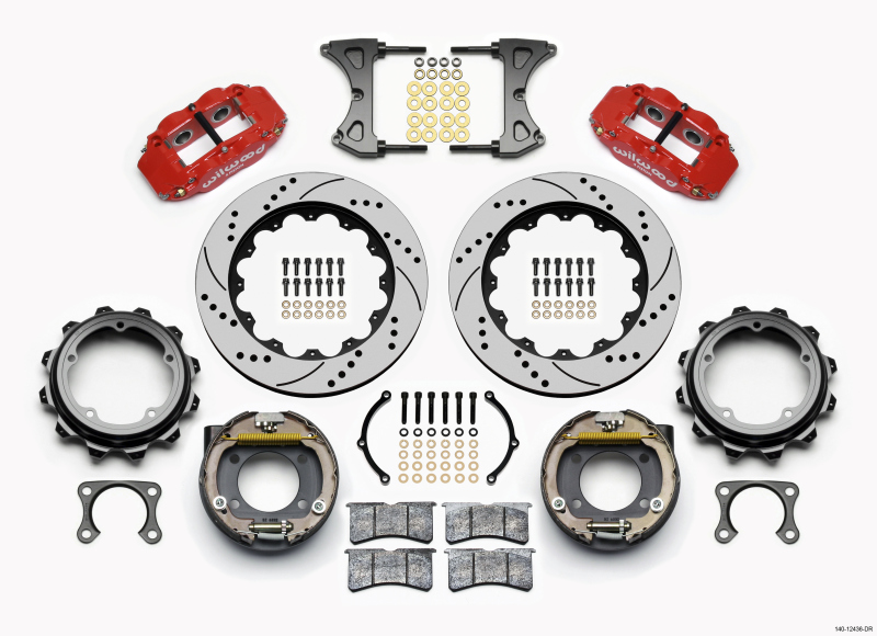 Forged Narrow Superlite 4R rear disc kits provide the ultimate Big Brake solution for popular muscle car rear axles that require a parking brake. FNSL4R four piston calipers, 13 or 14 two - piece rotors, and high performance BP - 10 compound pads provide optimized and balanced braking to compliment front big brake upgrades on all types of custom, show and high performance street machines. The neatly hidden internal shoe system provides a clean installation with superior static holding power for parking. Optional caliper finishes and rotor designs allow builders to personalize the style and performance for every application.