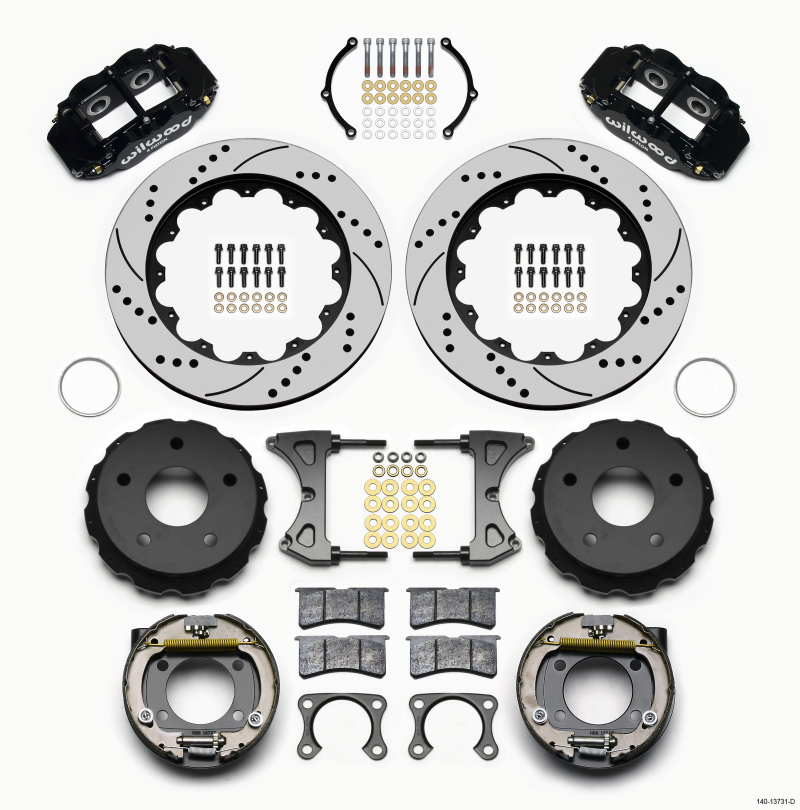 These versions of Forged Narrow Superlite 4R rear disc kits provide the ultimate Big Brake solution for Bronco 65 - 77 rear axles with Big Ford flange and bearing, with a 2.00 axle offset. Each includes a high efficiency drum style parking brake assembly. FNSL4R four piston calipers, 13 or 14 two - piece rotors, and high performance BP - 10 compound pads provide optimized and balanced braking to compliment front big brake upgrades available for Bronco platform. The neatly hidden internal shoe system provides a clean installation with superior static holding power for parking. Optional caliper finishes and rotor designs allow builders to personalize the style and performance for every application.
