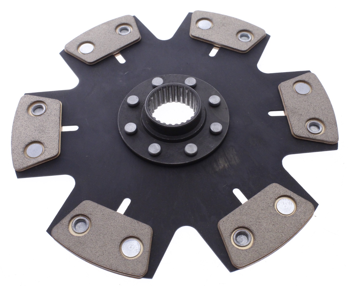 Sintered Disc 6-pad rigid race disc is made of high quality MIBA sintered ceramic friction materials. Chromium-moly hub is heat treated for strength and durability. Holds approx. 25% torque than standard organic materials.
