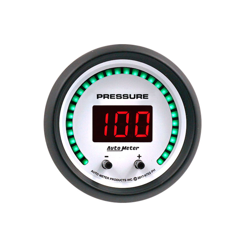 Sometimes the amount of data you want to see and the amount of space you have to display it aren't always compatible. New Elite Digital gauges from AutoMeter provide you with options to help optimize your instrumentation without compromising on critical performance data that you need to keep your vehicle operating at its best. This combination Fluid Pressure gauge allows you to 2 independent readings within a single 2 116 gauge which is matched to coordinate with popular AutoMeter designs. Featuring a bright LED seven segment display and 30 radial LED indicators,this digital instrument provides you with the ability to toggle between various display views in order to see each channel individually,a combination of both such as Channel 1 values displayed on the radial band and Channel 2 values reading out as a digital number in the center of the gauge,or a differential reading which indicates the difference between the two making this product ideal for comparing oil,coolant,and fuel pressures at various points in your vehicle's systems such as pre and post regulator or pump. Custom alarm points can also be programmed for each channel which can be used to trigger outputs to activate other devices such as lights or buzzers,as well as causing the onscreen gauge display to blink in order to draw the driver's attention to critical readings. User selectable units for imperial and metric measures.