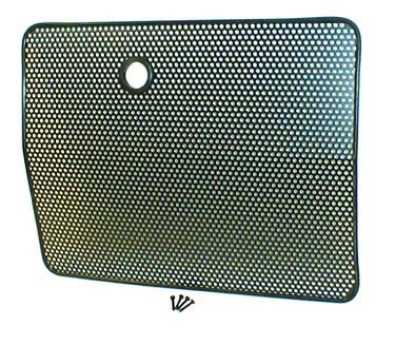 Protect your front grille from bugs and debris with this durable black radiator bug shield. Each externally mounted bug shield is perforated for better air flow. All shields are bound by soft rubber to prevent vehicle scratching. Installation requires some drilling. Includes all necessary hardware .